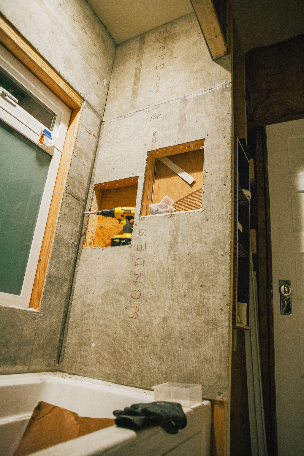 The shower stall wasn't terrible, but there would need to be cutouts for the 'His' and 'Hers' built-in shelves we'd be tiling, as well as (duh) the plumbing. The shelves were interesting. It was a bit of a process...